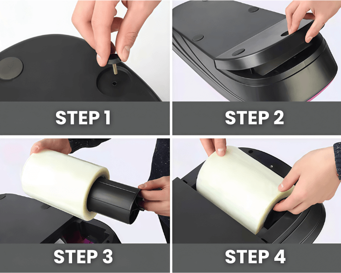 Refilling the shoe wrap machine is simple. Just open the bottom, remove the old roll, and insert the new one.